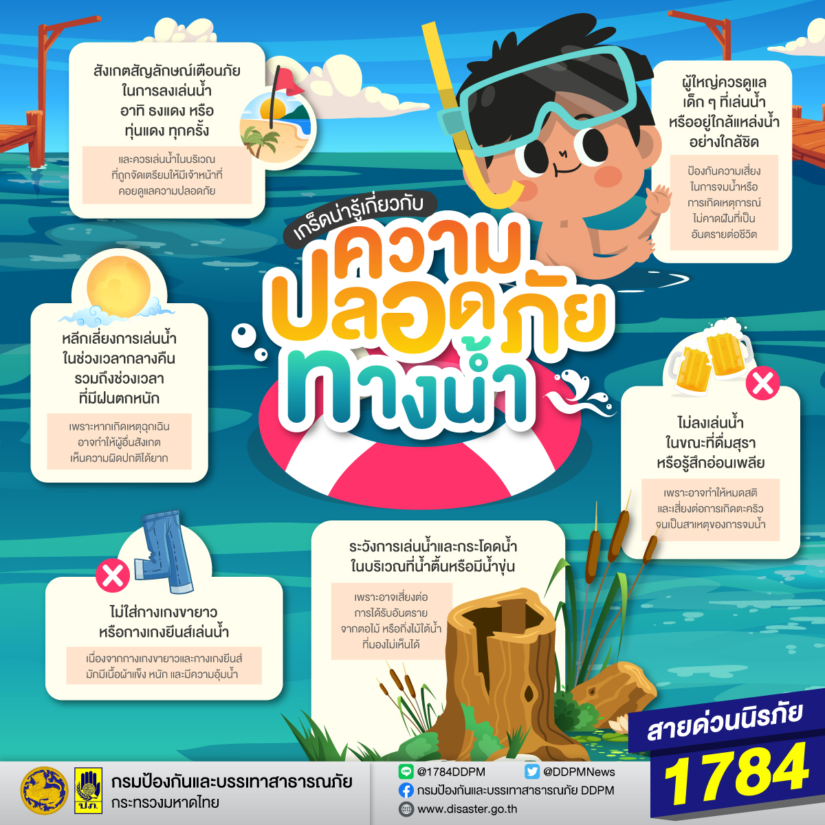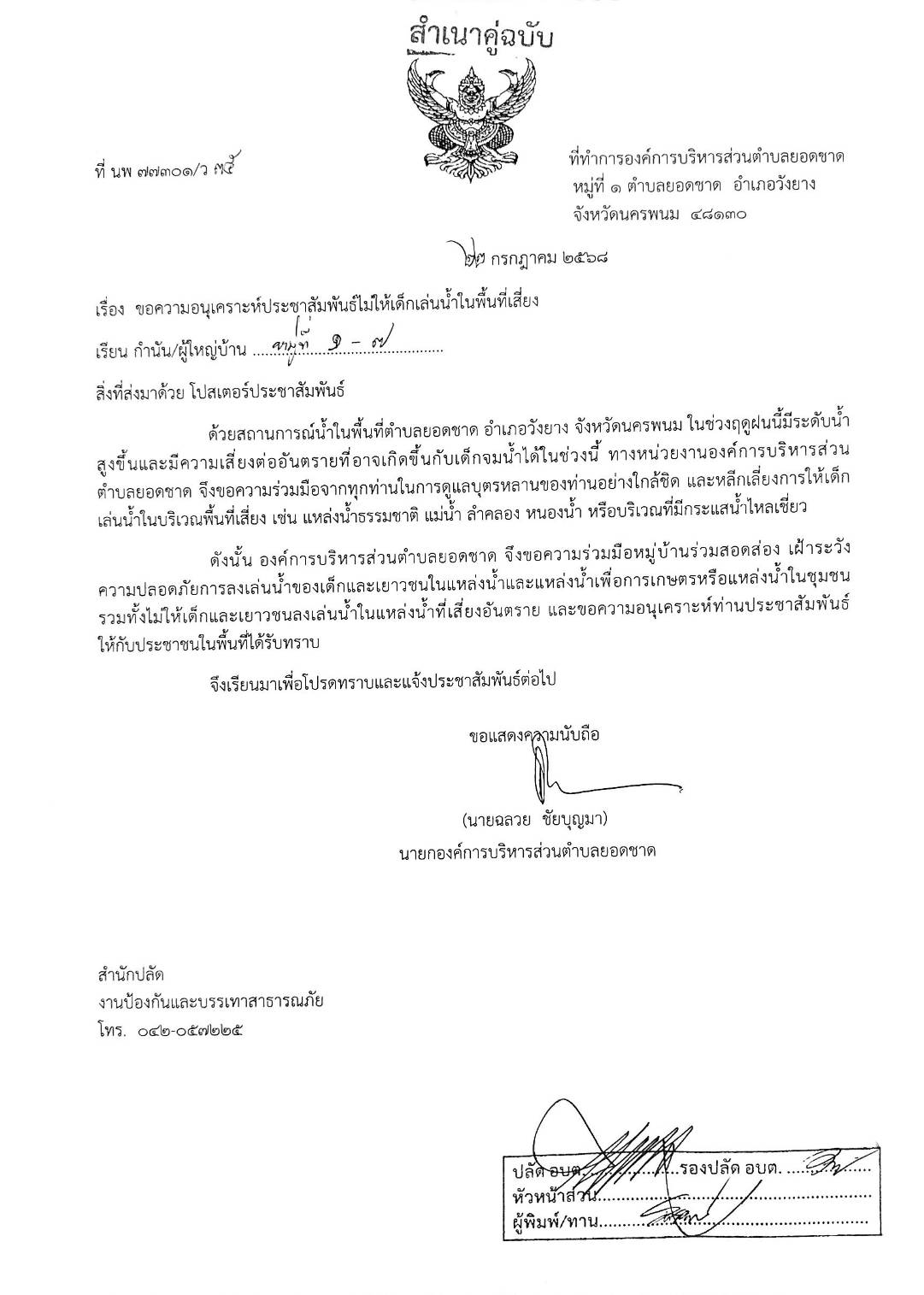 ประชาสัมพันธ์ไม่ให้เด็กเล่นน้ำในพื้นที่เสี่ยง องค์การบริหารส่วนตำบลยอดชาด อำเภอวังยาง จังหวัดนครพนม