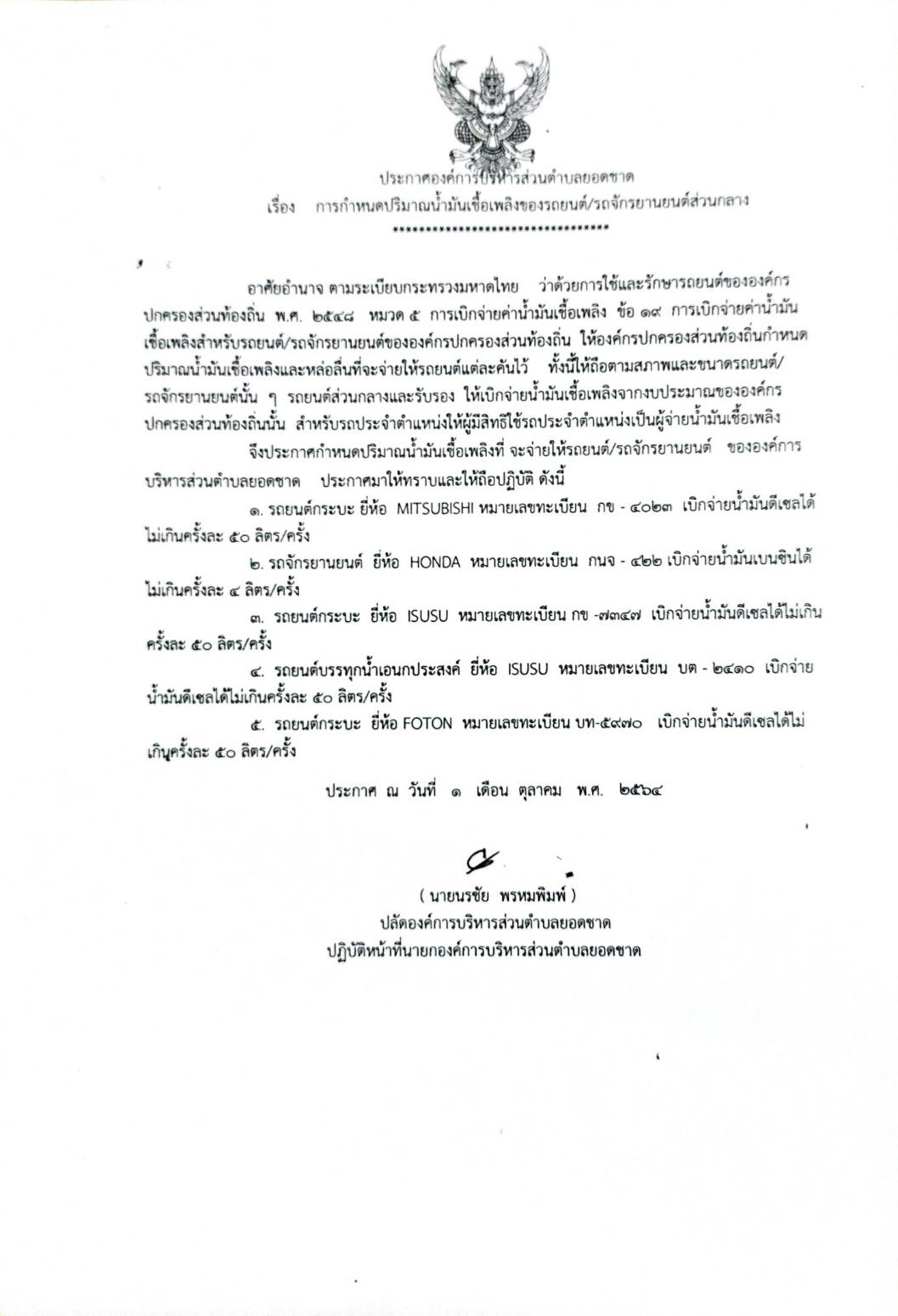 กำหนดปริมาณน้ำมันเชื้อเพลิงของรถยนต์/รถจักรยานยนต์ส่วนกลาง ขององค์การบริหารส่วนตำบลยอดชาด