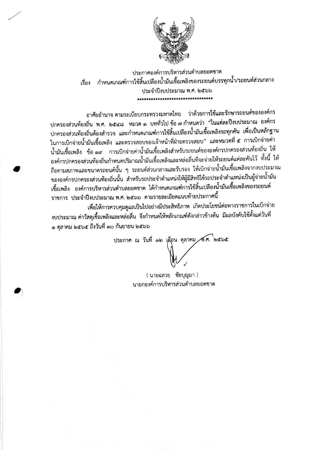 ประกาศองค์การบริหารส่วนตำบลยอดชาด เรื่อง กำหนดเกณฑ์ปริมาณการใช้สิ้นเปลืองน้ำมันเชื้อเพลิงและหลื่อลื่นของรถยนต์ส่วนกลาง ขององค์การบริหารส่วนตำบลยอดชาด ประจำปีงบประมาณ พ.ศ. 2566
