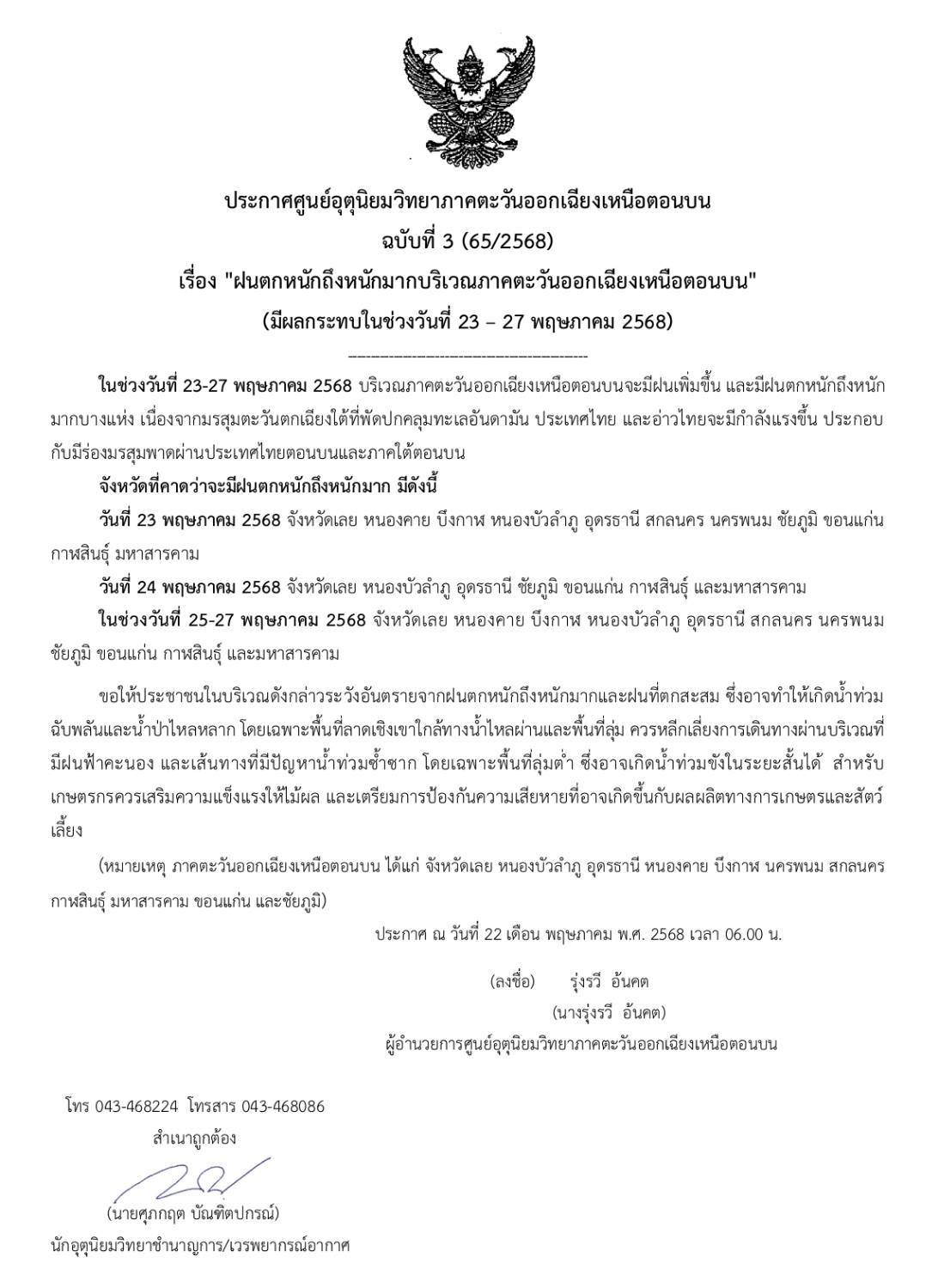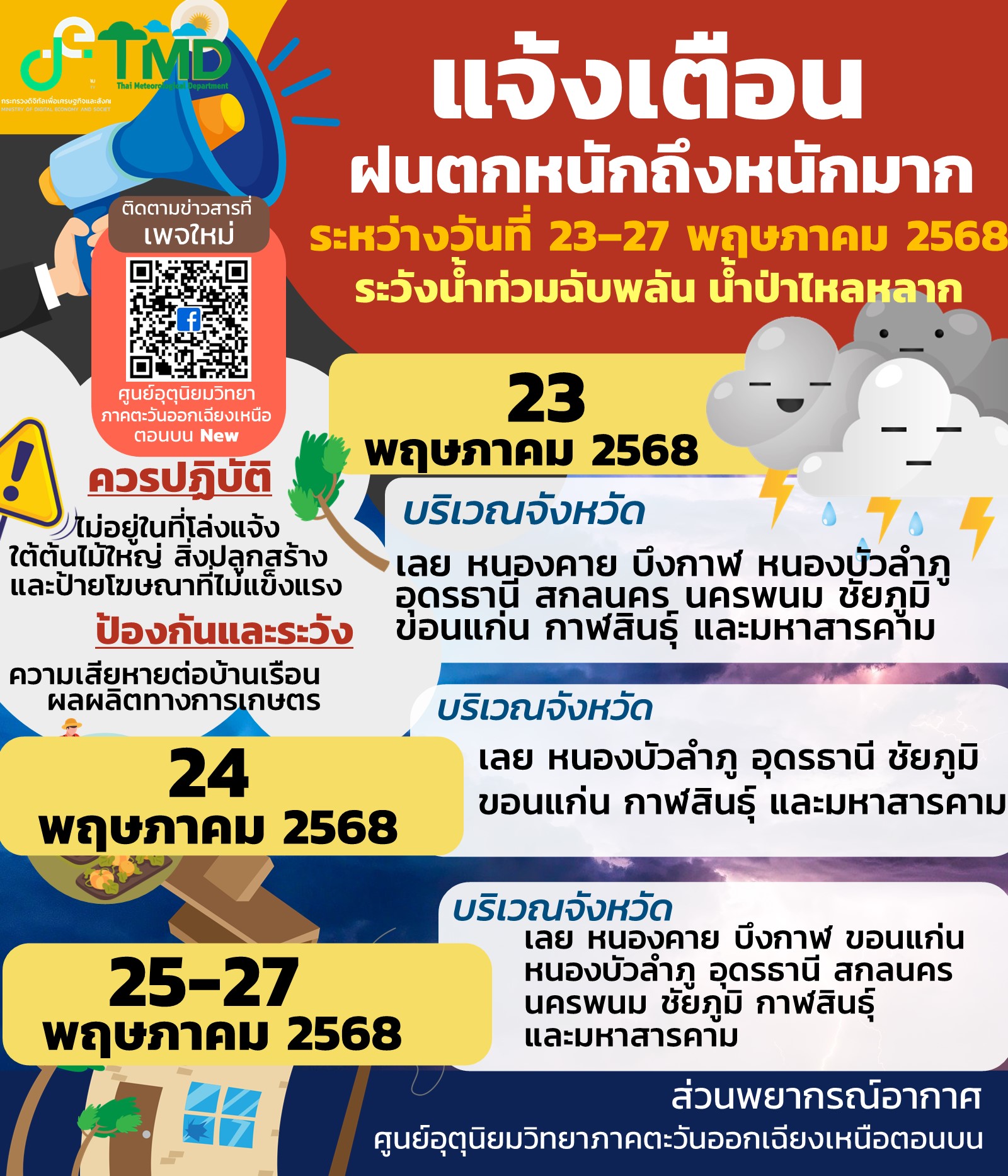 ฝนตกหนักถึงหนักมากบริเวณภาคตะวันออกเฉียงเหนือตอนบน(มีผลกระทบในช่วงวันที่ 23-27พฤษภาคม2568)